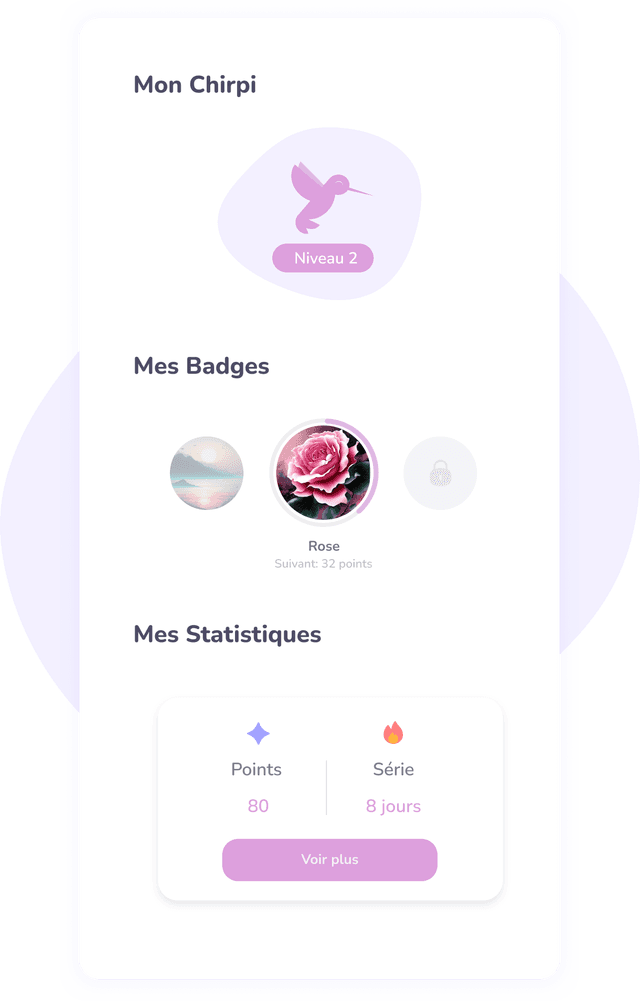 C'est pourquoi nous avons créé Chirpi : non pas avec des promesses irréalistes de changement du jour au lendemain, mais avec l’engagement de vous accompagner sur le chemin de ce qui vous rend vraiment heureux ou heureuse, de manière simple et amusante. Chirpi est conçu pour être un compagnon fiable, offrant aide et conseils chaque fois que vous en avez besoin.